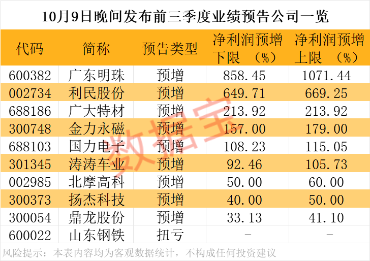10月9日晚间,多家上市公司发布三季报业绩预增公告。以预增上限统计,广东明珠(600382)、利民股份(002734)、广大特材、金力永磁(300748)、国力电子、涛涛车业(301345)预计前三季度归母净利润同比翻番,北摩高科(002985)、扬杰科技(300373)、鼎龙股份(300054)等业绩预增,山东钢铁(600022)业绩扭亏。