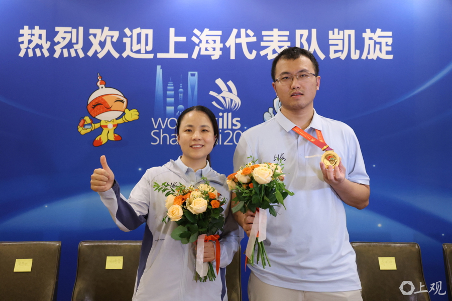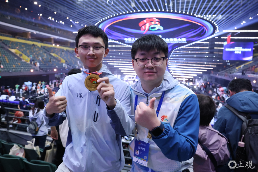 9月23日晚,第三届全国技能大赛在河南郑州落幕,上海代表团选手斩获9枚金牌,5枚银牌,3枚铜牌,72个优胜奖,成绩优异,稳居全国第一方阵。\n这是上海信息技术学校学生、网站技术选手高书恒和他的导师冯家乐欢庆凯旋。