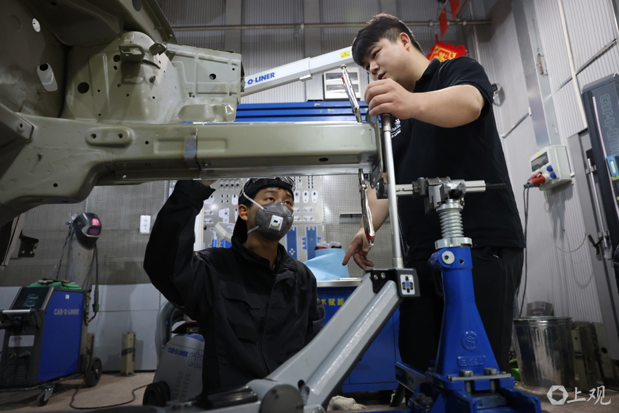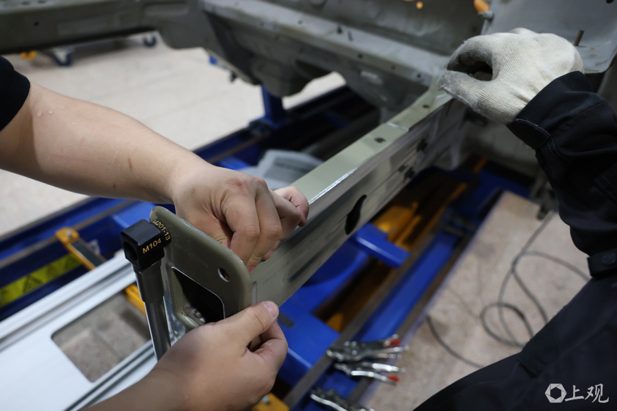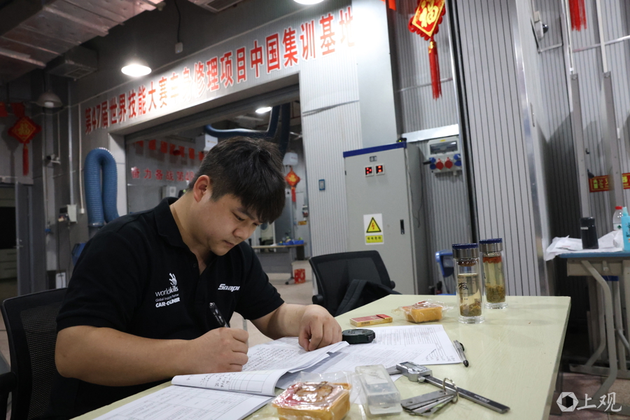 10月8日一大早,汽车实训中心大楼内车身修复操作间内,身材瘦小的娇焦身手矫健,专心修复一辆车头被严重“毁容”的模拟事故车辆,一边紧盯车身测量与校正仪,一边变换各种工具敲敲打打模拟结构件。在一旁巡回观摩的教练丁志鹏记录他的思路和反应,密密麻麻已经写了三页,以待晚上和学科负责人马波一起复盘,国庆长假八天他们也没休息。