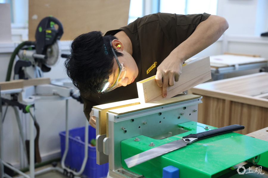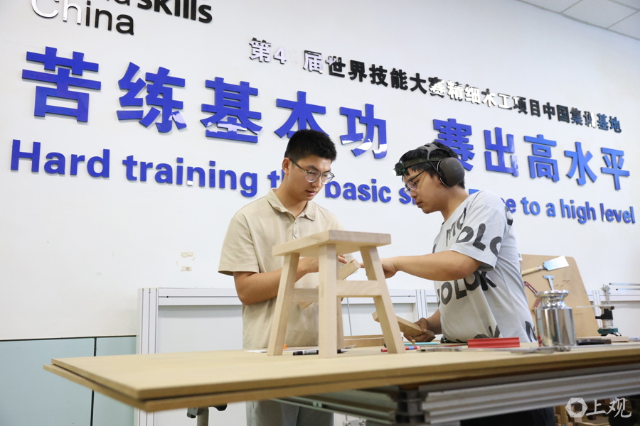上海市城市科技学校精细木工实训基地内,曾经获得世赛冠军的邵茹鹏如今已是选手们“一对一”的指导老师。他的弟子张俊杰在本届国赛中取得第八名的成绩,虽然不达预期,但所幸进入国赛集训队。除了吃饭睡觉就是训练,他将世界技能大赛的国际标准融入日常教学,对学生习作,从图纸绘制、杆件制作到榫卯连接、拼装打磨,全流程进行近乎苛刻的锤炼。