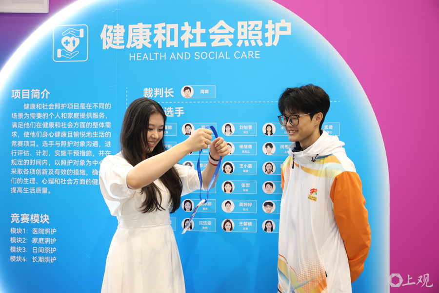 这是健康和社会照护项目冠军闵思达站上领奖台。