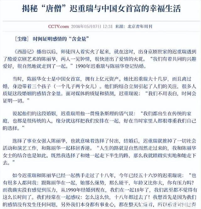 无论是迟重瑞的富贵生活,还是徐少华的平淡日子。 只要自己感到幸福,便是圆满人生。 每个人的取经路不同,但只要坚持自己的信念,都能取得人生的真经。 【免责声明】 文章描述过程、图片都来源于网络,此文章旨在倡导社会正能量,无低俗等不良引导。 如涉及版权或者人物侵权问题,请及时联系我们,我们将第一时间删除内容! 如有事件存疑部分,联系后即刻删除或作出更改。 信息来源 揭秘“唐僧”迟重瑞与中国女首富的幸福生活.北京青年周刊.2008-05-07